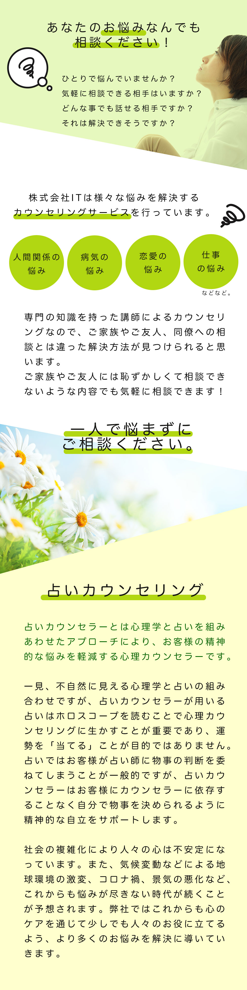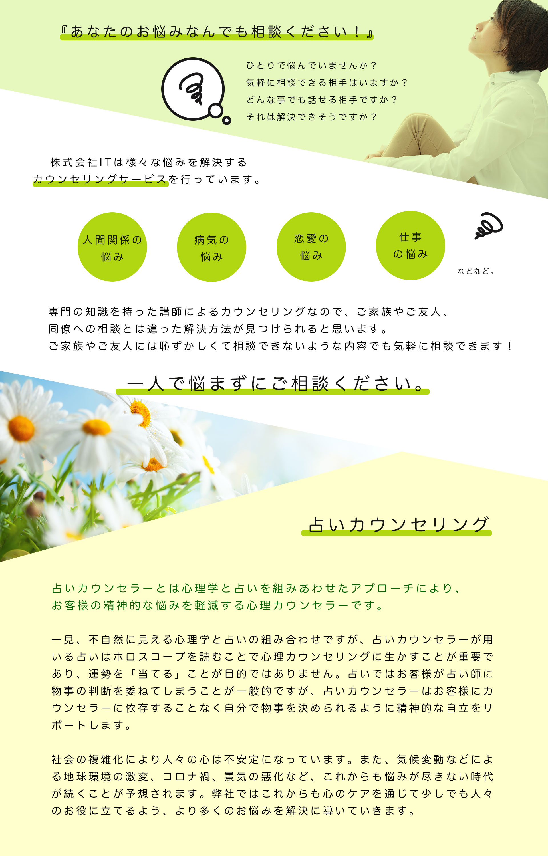 | 電話カウンセリング | 直接電話にてご希望のカウンセリングを受けることが出来ます。 専任のカウンセラーが優しくお悩みを解決致します。 |